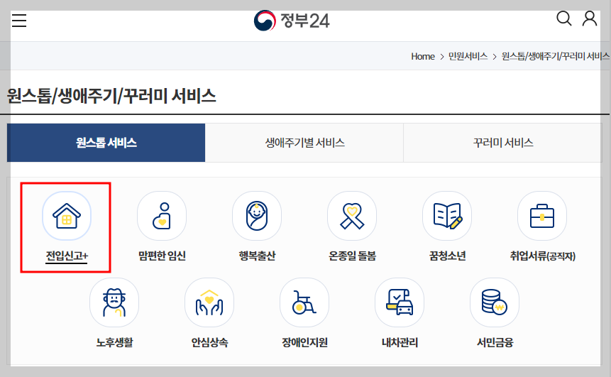 1. 정부24 홈페이지 -> 공인인증서 로그인 -> 민원서비스 -> 원스톱서비스 -> 전입신고 선택