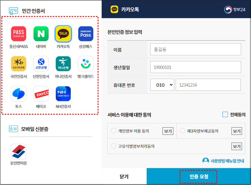 민간인증서 중에서 편한 방법으로 인증합니다.
