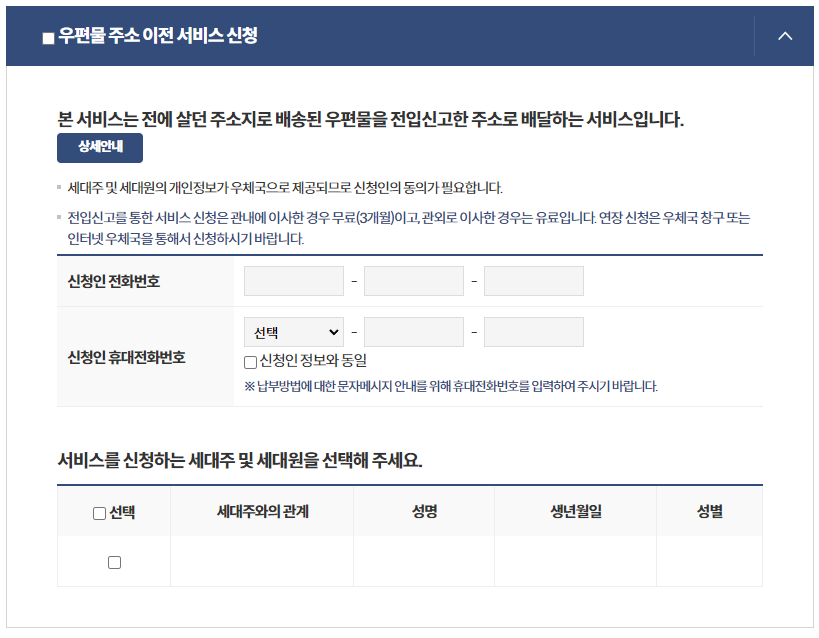 민원신청하기 완료하기전에 [우편물 주소 이전 서비스 신청] 을 선택해서 입력하시면 함께 신청됩니다.
