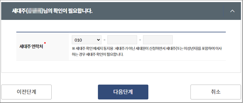 세대주의 확인이 필요하다고 안내가 나옵니다. ( 세대주 연락처 입력하세요 )