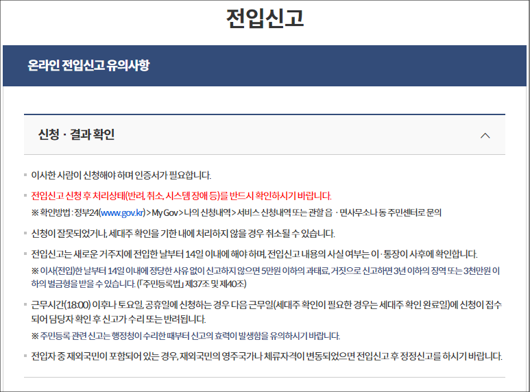 - 전입신고 신청 후 처리상태(반려, 취소, 시스템 장애 등)를 반드시 확인하시기 바랍니다.
