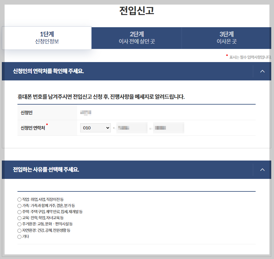 이제 전입신고 신청자와 연락처 확인을 하고 전입 사유를 선택합니다.