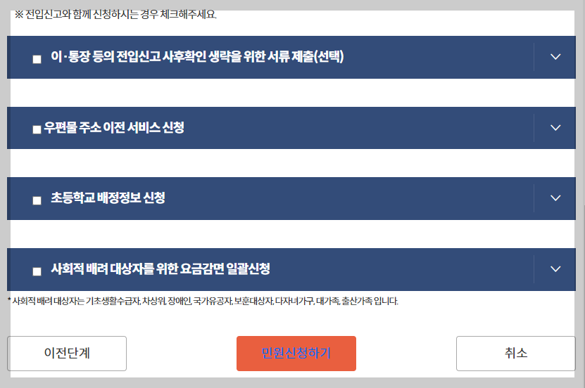 전입신고와 요금감면 일괄신청 (전입신고+) - [ 신청 ] 선합니다.
